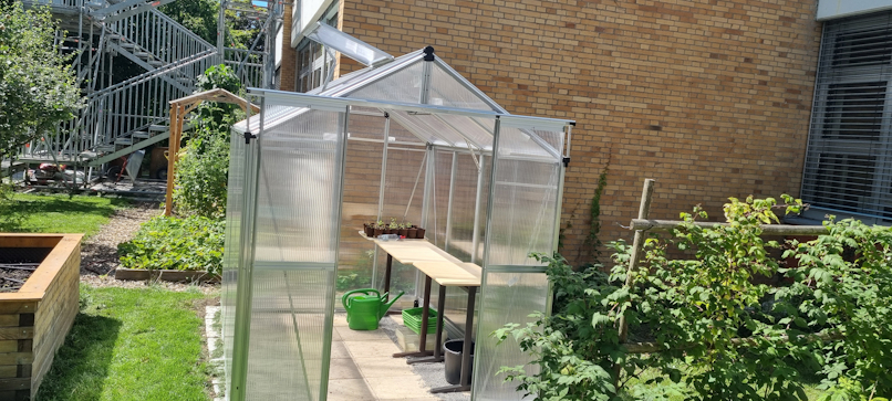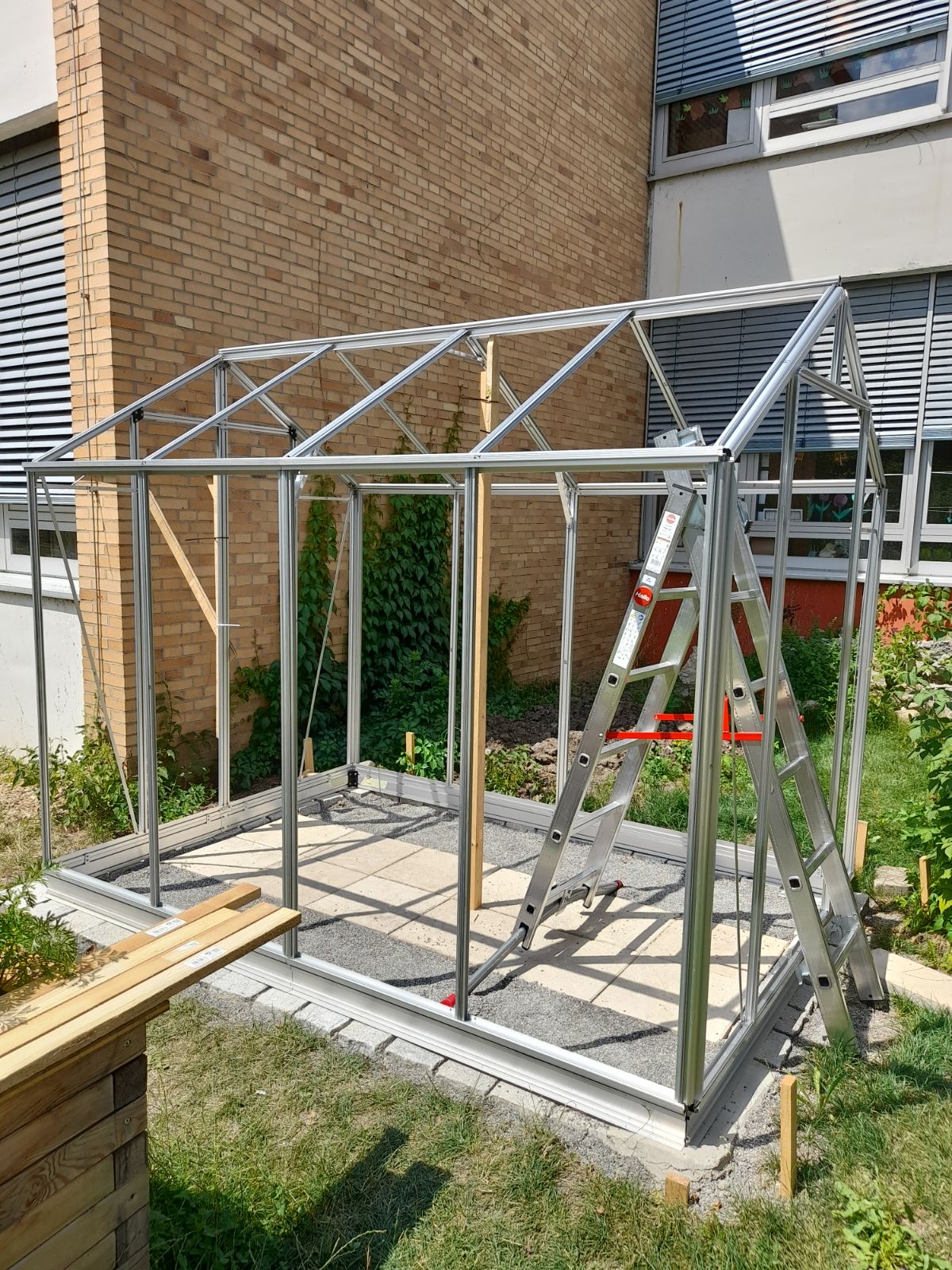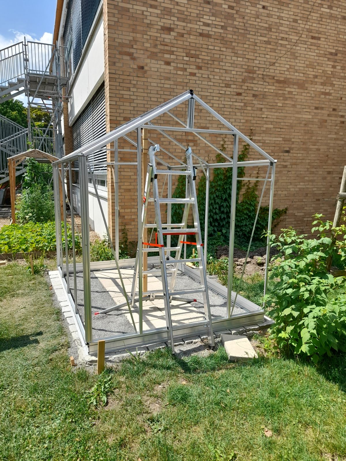 Leider hat der Aufbau des neuen Gewächshauses nicht mehr ganz ins Schuljahr gepasst. Mit viel Aufwand wurde in den letzten Wochen mit Schülern der Garten-AGs und Helfern aus Klasse 10 ein Fundament ausgehoben. Dank einer Spende der Firma GN Tiefbau konnten wir nach dem Betonieren der Fundamente auch die Fläche mit Splitt befüllen. Anschließend ging es an das sehr mühsame Zusammenbauen der vielen hundert Einzelteile mit einer sehr schlechten Anleitung. Daher haben die letzten Arbeiten auch in der ersten Ferienwoche stattfinden müssen. Es wurde noch die automatische Fensterbelüftung und die Türen installiert. Jetzt steht der sicheren Anzucht von Blumen und Gemüse nichts mehr im Wege!
