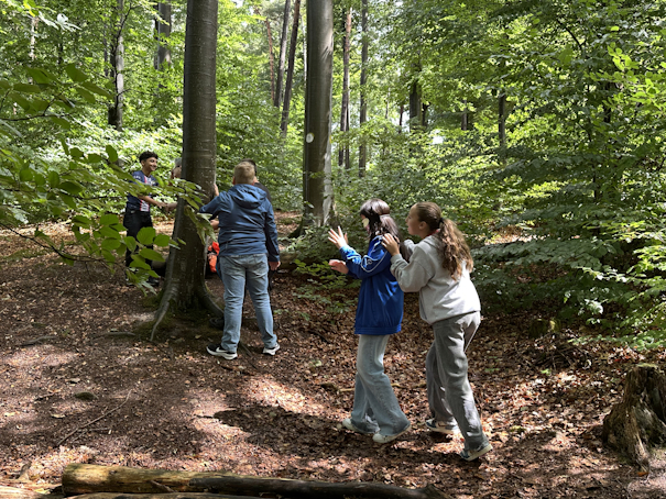 Leider machte uns das Wetter einen Strich durch die Rechnung. Statt in den Wald ging es erst einmal ins Vogelschutzzentrum. Dort durften wir uns im Trockenen in Ruhe umschauen und die Ferngläser ausprobieren. Als der Regen endlich aufhörte, ging es noch für eine kurze Erkundung in den Wald. Mit verbundenen Augen fühlte jeder einen Baum, den er anschließend ohne Binde wieder finden musste.