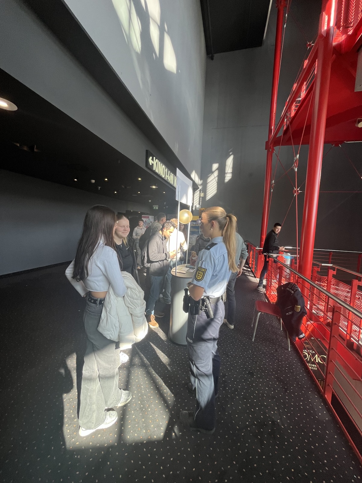 Im Kino präsentierten sich zahlreiche namhafte Unternehmen und Institutionen mit ihren Informationsständen – darunter Daimler, Dachser, das Deutsche Rote Kreuz (DRK), die Polizei und viele weitere Betriebe aus der Region. Die Schülerinnen und Schüler hatten die Gelegenheit, direkt mit Auszubildenden und Personalverantwortlichen ins Gespräch zu kommen, Fragen zu stellen und Informationsmaterialien zu sammeln.